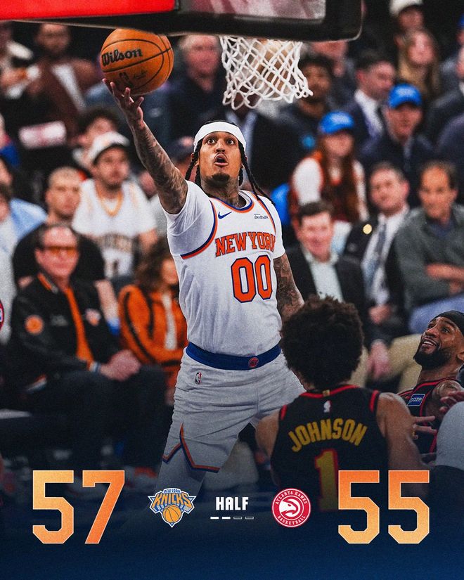 尼克斯队的布伦森上半场得到22分、3个篮板和3次助攻,阿奴诺比得到11分和5个篮板;老鹰队的麦科勒姆得到17分,奥孔古得到12分,约翰逊得到10分和4个篮板。